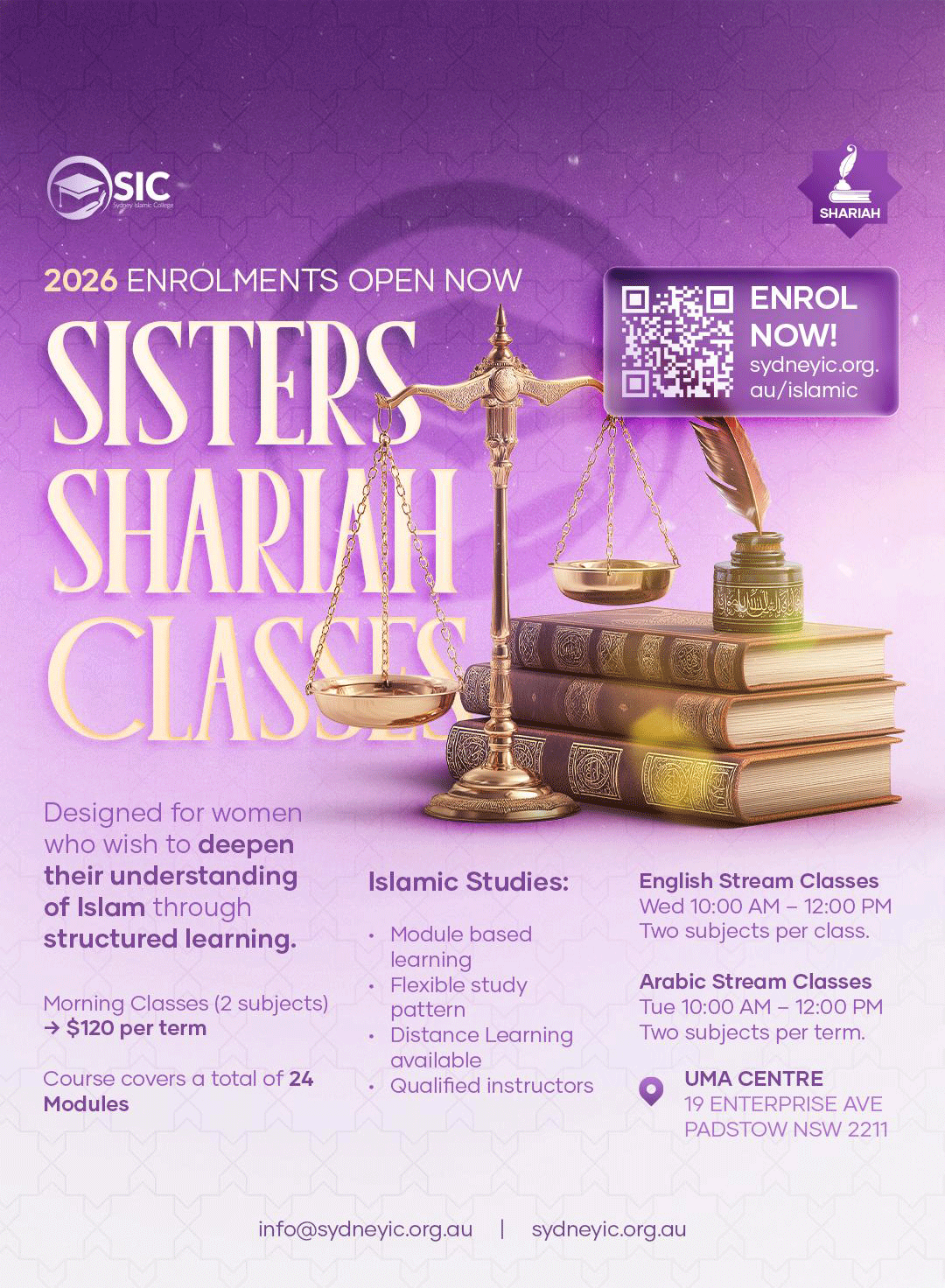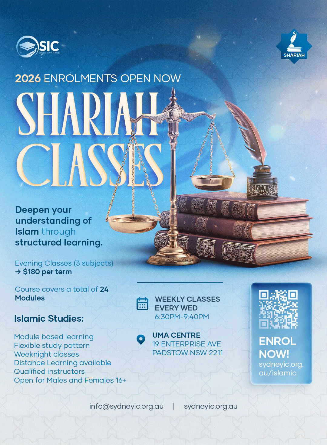 The shariah course covers a total of 24 modules over a 2 year period. Starting from the basics of religion, to advance subjects within the Islamic Shariah